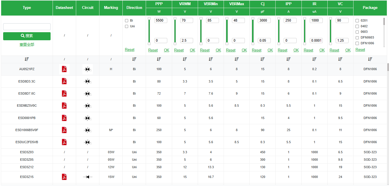 峰值脈沖電流和反向漏電流也是選型時需要考慮的重要參數。峰值脈沖電流表示靜電二極管在靜電事件中能夠承受的最大電流值,它反映了二極管的耐受能力和保護能力。而反向漏電流則是在正常工作電壓下,靜電二極管的漏電流大小。較大的漏電流可能會導致功耗增加,尤其是在電池供電的設備中,這一點尤為重要。
