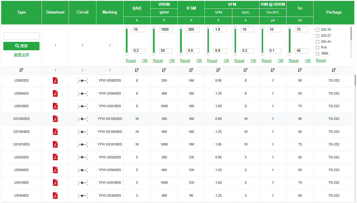 二極管的型號通常直接標注在器件上,例如常見的1N5819(肖特基二極管)或UF4007(超快恢復二極管)。通過這些型號,可以查詢到二極管的詳細參數,如正向壓降、最大正向電流和反向恢復時間。這些信息可以幫助工程師快速識別是否為高效率二極管,并判斷其是否適合特定應用。